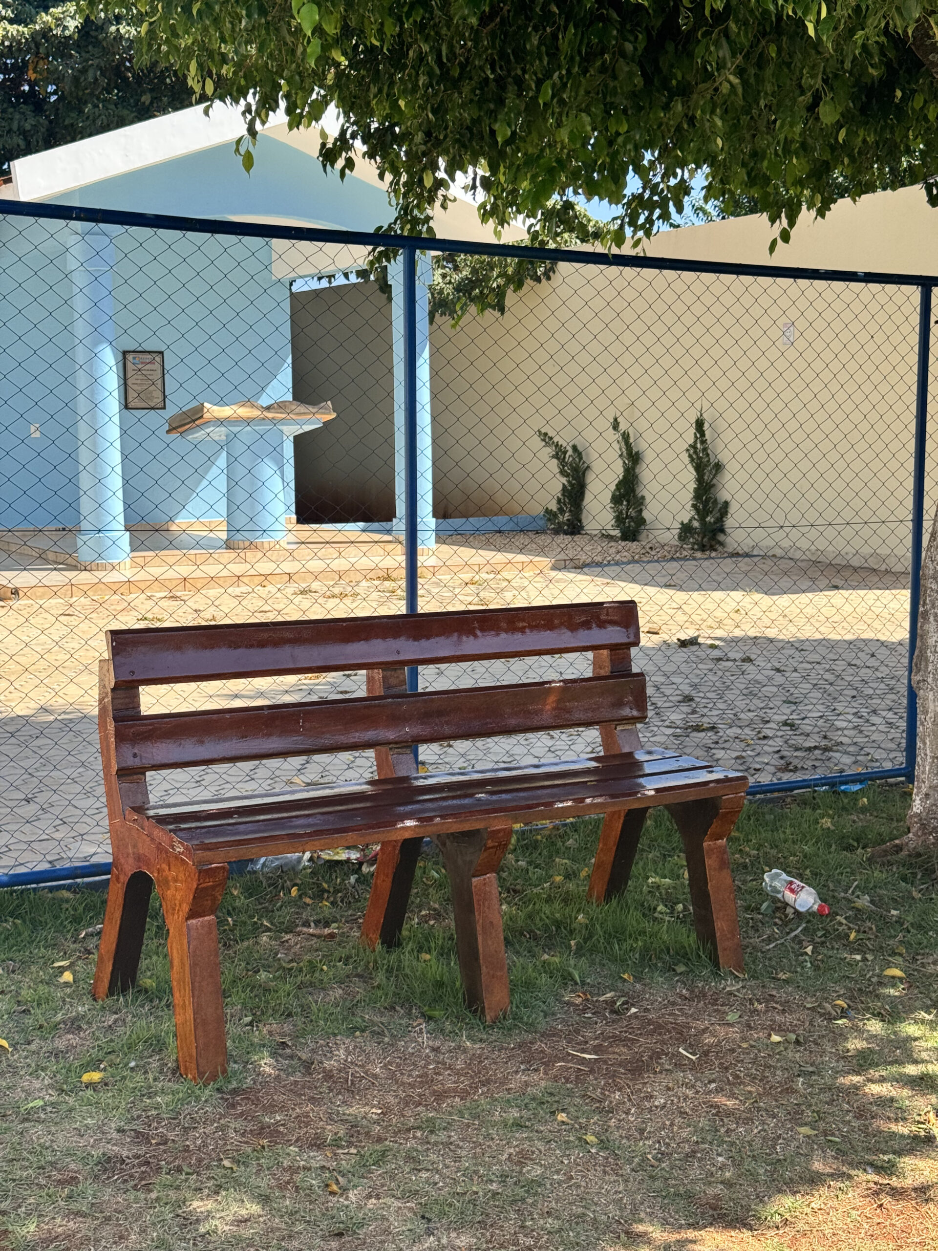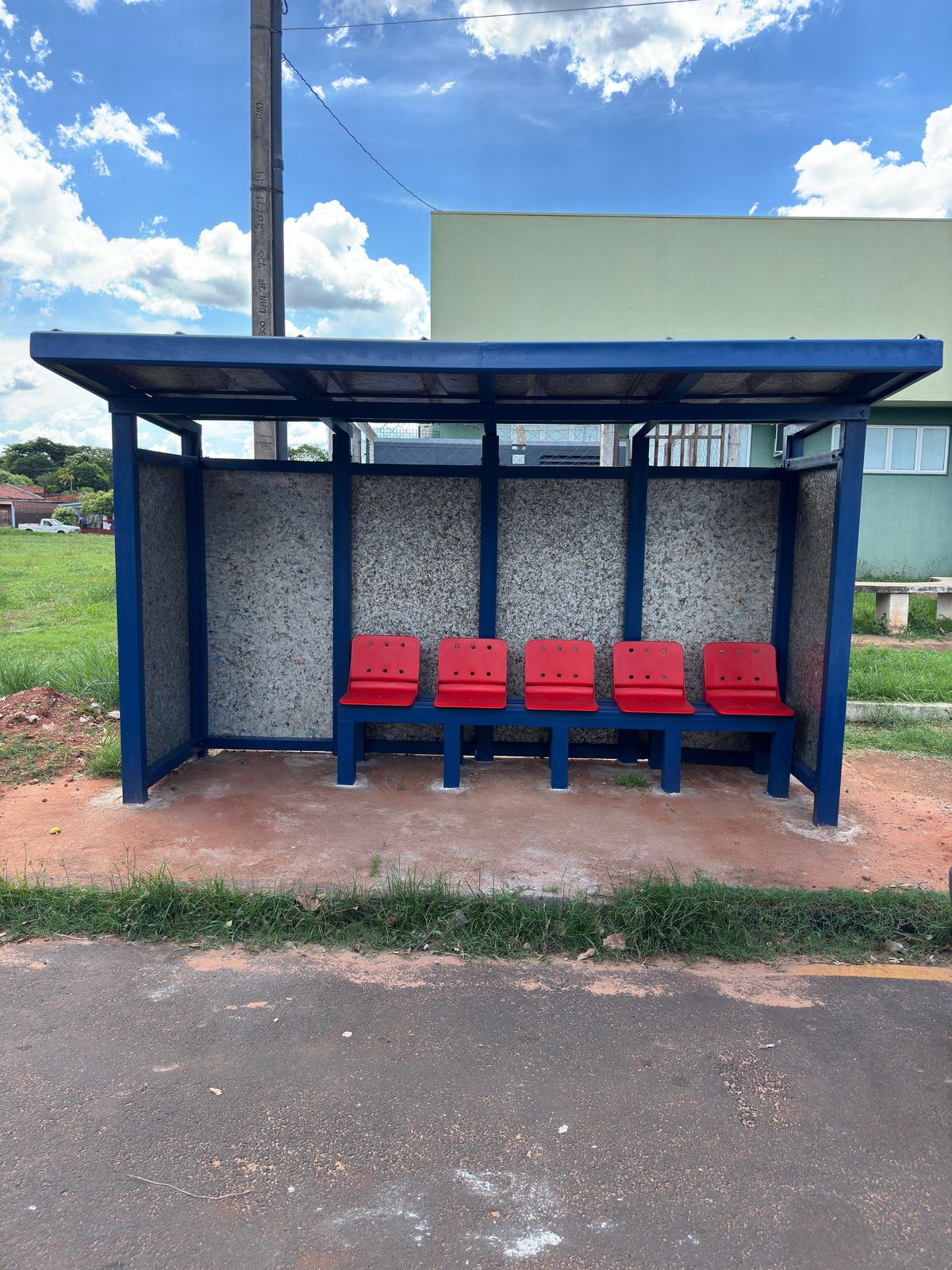 Abrigo para banco de reservas sustentável. Feito com materiais recicláveis, oferece proteção, conforto e durabilidade para atletas e comissão técnica.